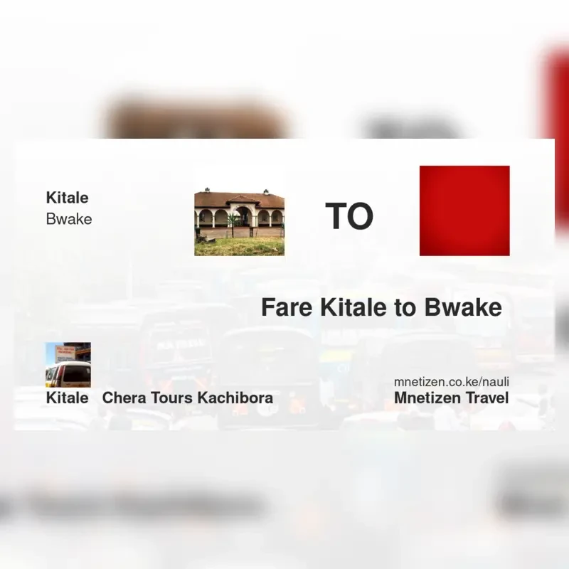 The fare from Kitale to Bwake with Kitale - Chera Tours Kachibora is . Prices may vary during holidays and school terms.