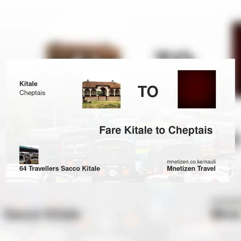 The fare from Kitale to Cheptais with 64 Travellers SACCO kitale is . Prices may vary during holidays and school terms.