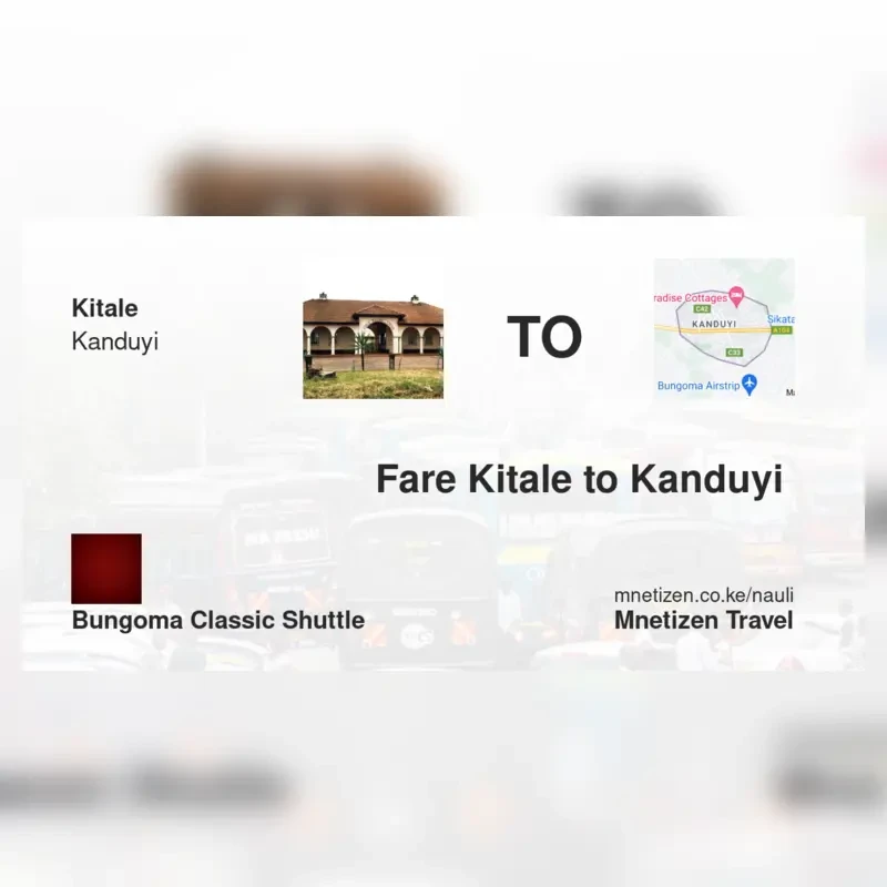 The fare from Kitale to Kanduyi with Bungoma classic shuttle is . Prices may vary during holidays and school terms.
