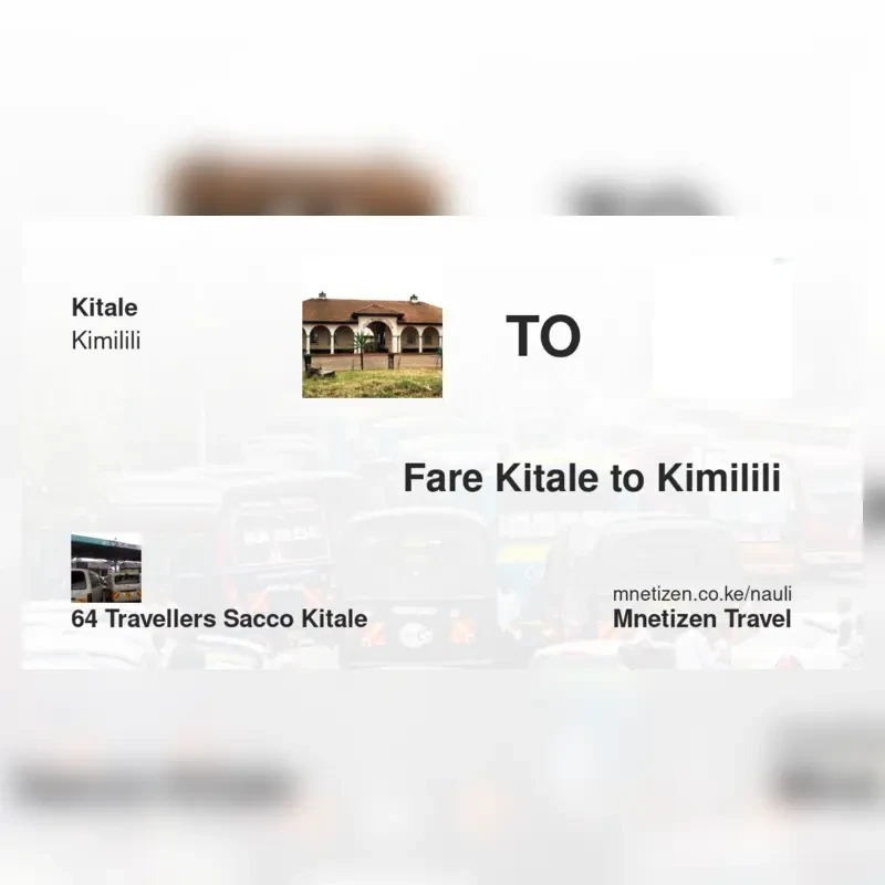 The fare from Kitale to Kimilili with 64 Travellers SACCO kitale is . Prices may vary during holidays and school terms.