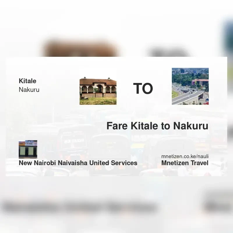 The fare from Kitale to Nakuru with New Nairobi naivaisha United Services is . Prices may vary during holidays and school terms.
