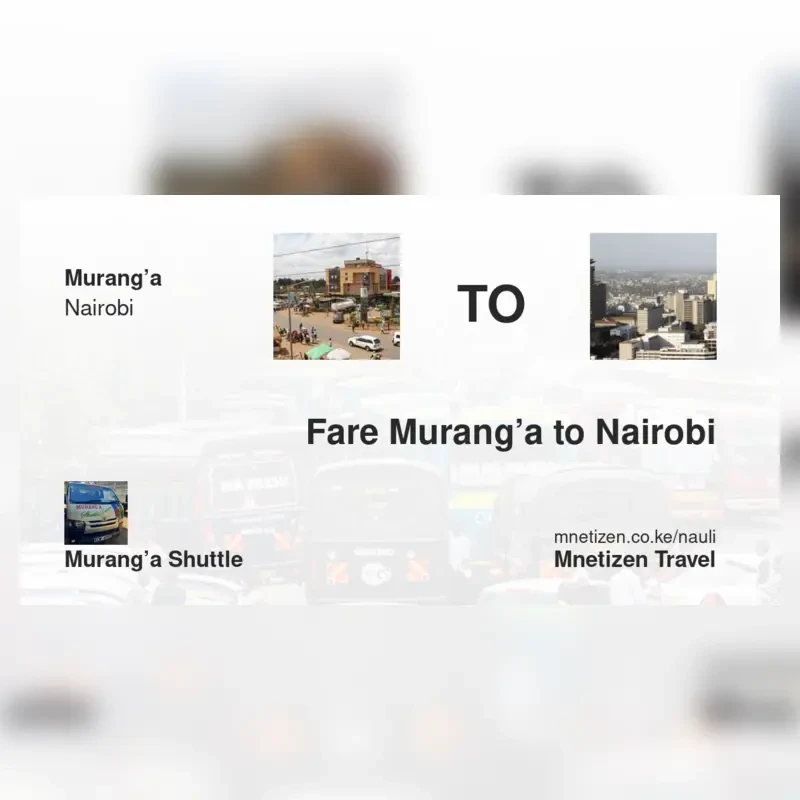 The fare from Murang’a to Nairobi with Murang’a Shuttle is . Prices may vary during holidays and school terms.