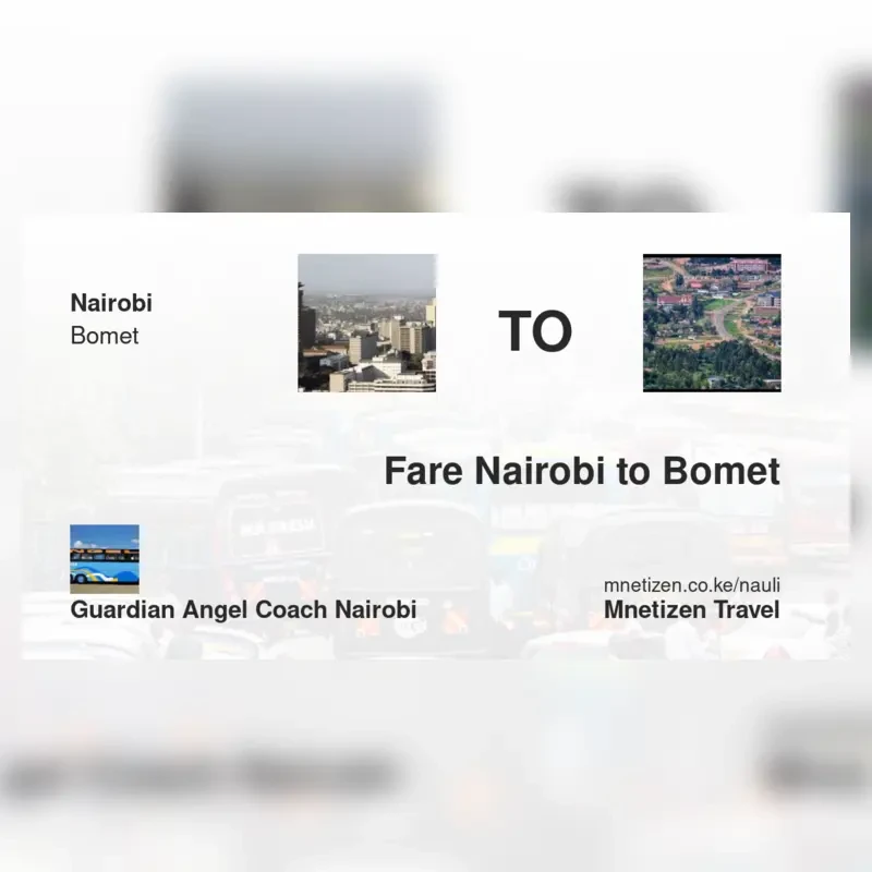 | Nairobi Bomet | Guardian angel coach nairobi Shuttle | – | – | ksh 1,650 Book |