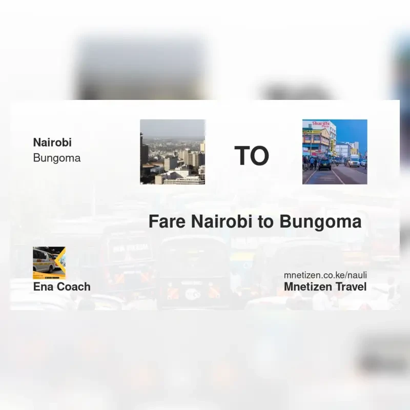 The fare from Nairobi to Bungoma with ENA Coach is . Prices may vary during holidays and school terms.