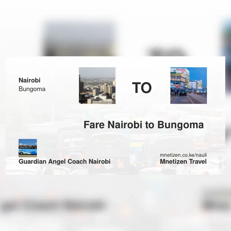 The fare from Nairobi to Bungoma with Guardian Angel Coach Nairobi is . Prices may vary during holidays and school terms.