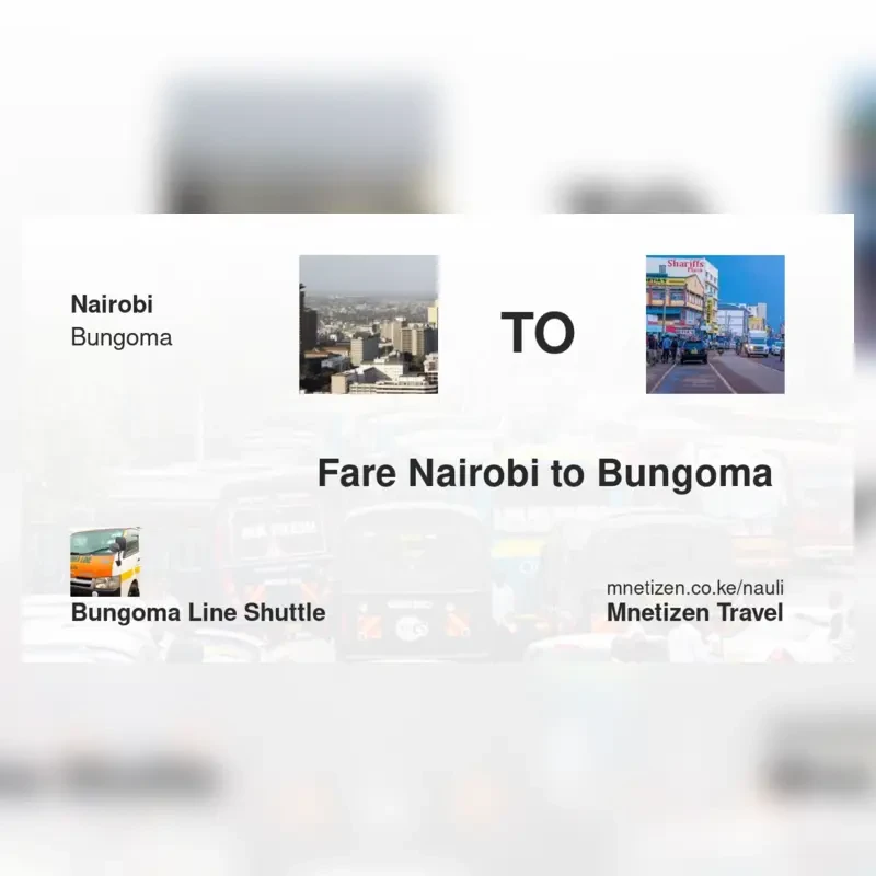 The fare from Nairobi to Bungoma with bungoma line shuttle is . Prices may vary during holidays and school terms.