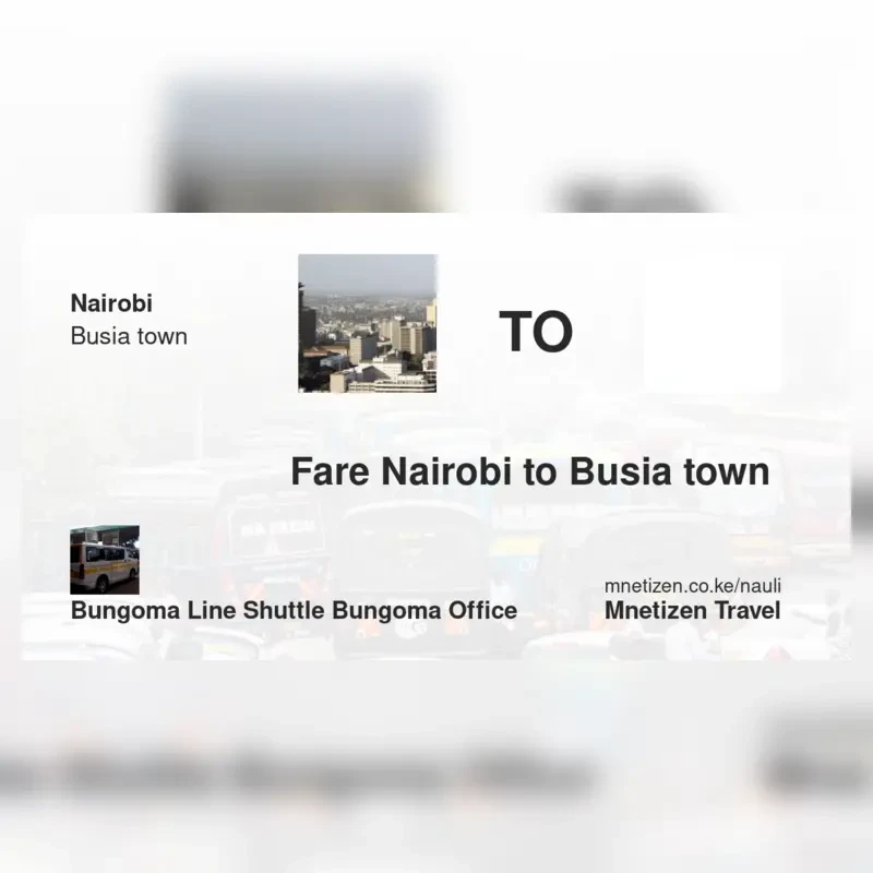 The fare from Nairobi to Busia Town with Bungoma line shuttle bungoma office is . Prices may vary during holidays and school terms.