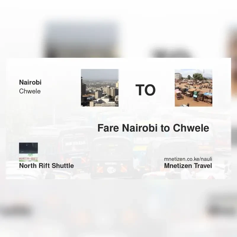 The fare from Nairobi to Chwele with North Rift Shuttle is . Prices may vary during holidays and school terms.