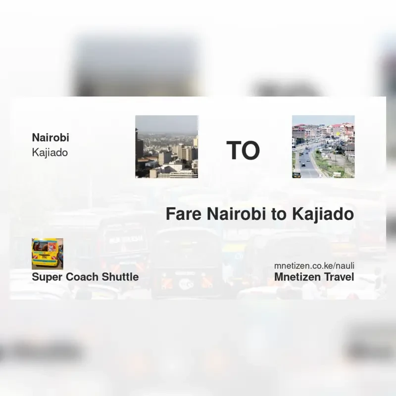 The fare from Nairobi to Kajiado with Super Coach Shuttle is . Prices may vary during holidays and school terms.