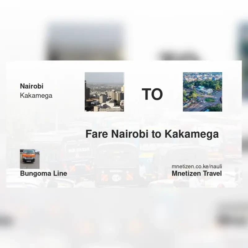 The fare from Nairobi to Kakamega with Bungoma Line is . Prices may vary during holidays and school terms.