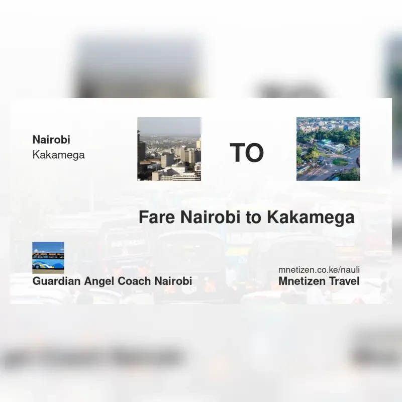 The fare from Nairobi to Kakamega with Guardian Angel Coach Nairobi is . Prices may vary during holidays and school terms.