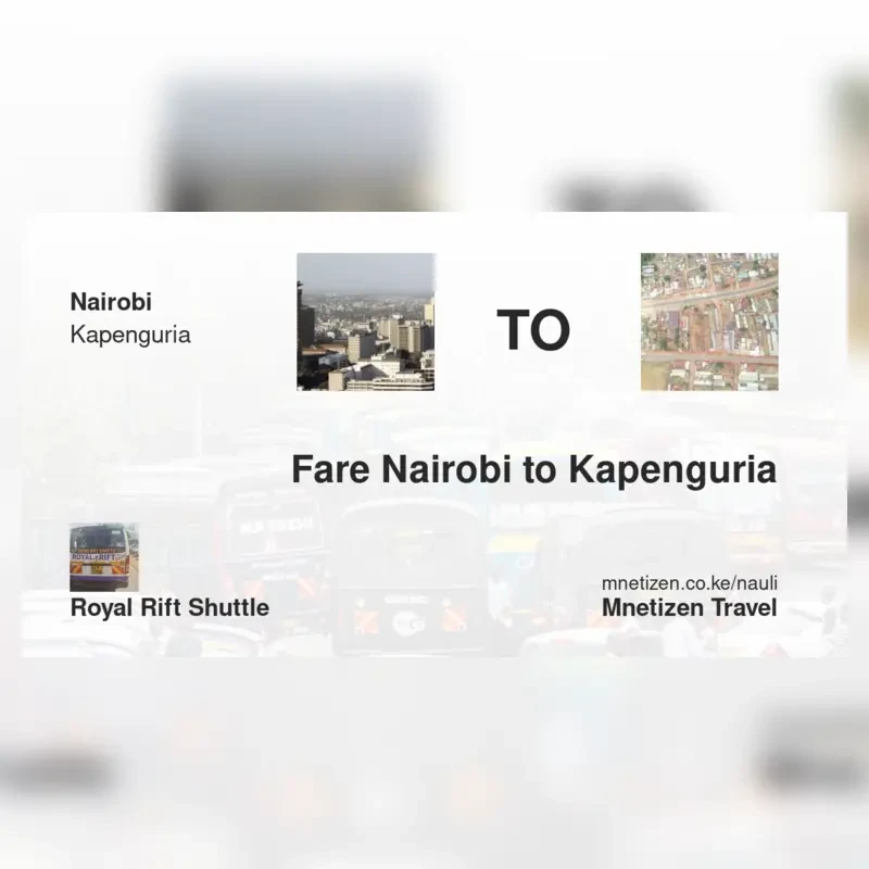 The fare from Nairobi to Kapenguria with Royal Rift Shuttle is . Prices may vary during holidays and school terms.