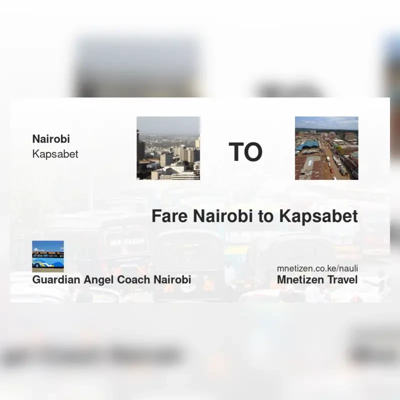 The fare from Nairobi to Kapsabet with Guardian Angel Coach Nairobi is . Prices may vary during holidays and school terms.