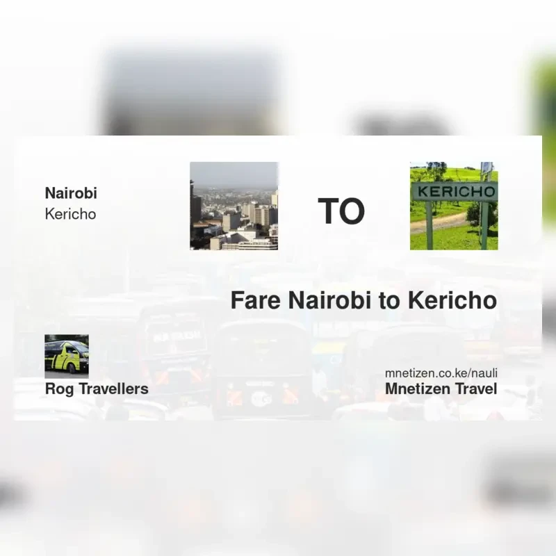 The fare from Nairobi to Kericho with Rog Travellers is . Prices may vary during holidays and school terms.