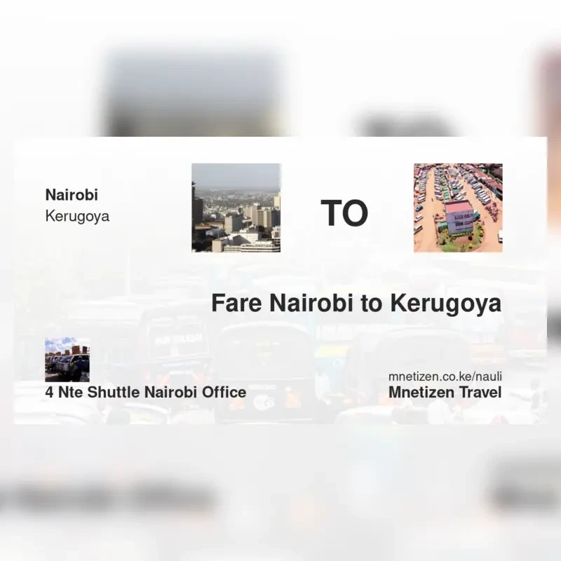 The fare from Nairobi to Kerugoya with 4NTE Shuttle Nairobi Office is . Prices may vary during holidays and school terms.