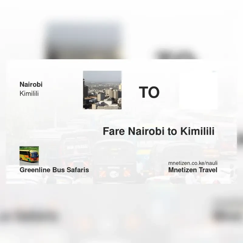 The fare from Nairobi to Kimilili with Greenline Bus Safaris is . Prices may vary during holidays and school terms.