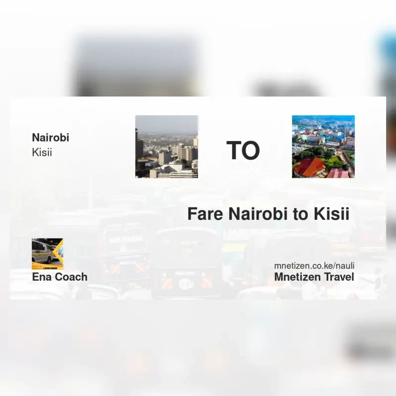 The fare from Nairobi to Kisii with ENA Coach is . Prices may vary during holidays and school terms.