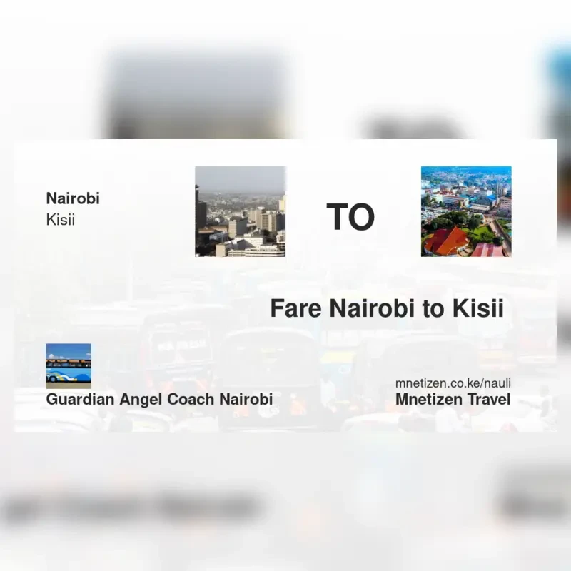 The fare from Nairobi to Kisii with Guardian Angel Coach Nairobi is . Prices may vary during holidays and school terms.