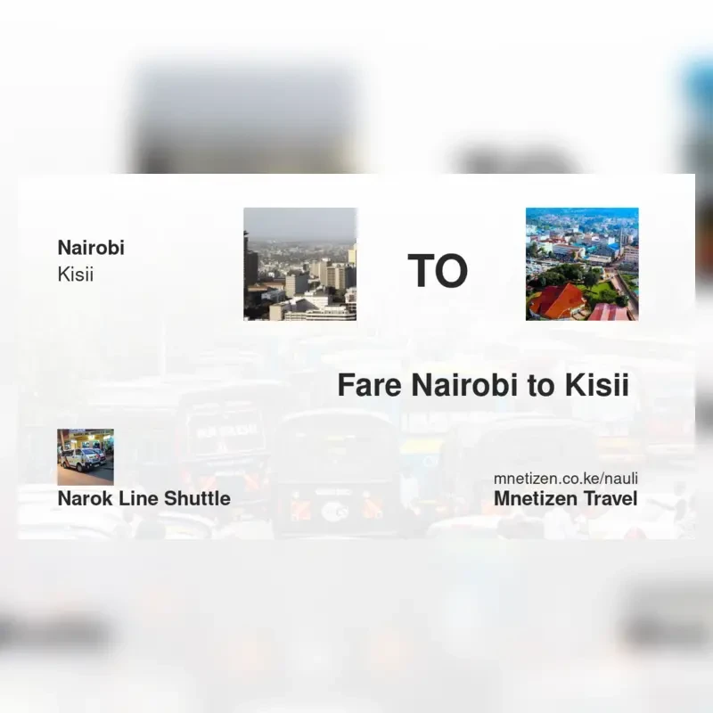 The fare from Nairobi to Kisii with Narok Line shuttle is . Prices may vary during holidays and school terms.