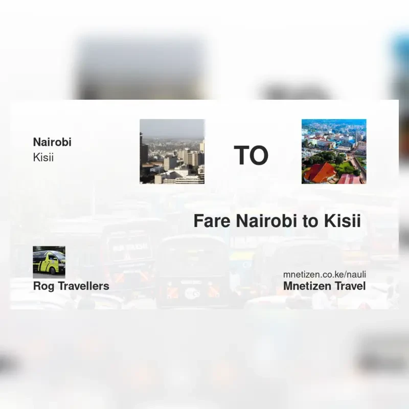 The fare from Nairobi to Kisii with Rog Travellers is . Prices may vary during holidays and school terms.
