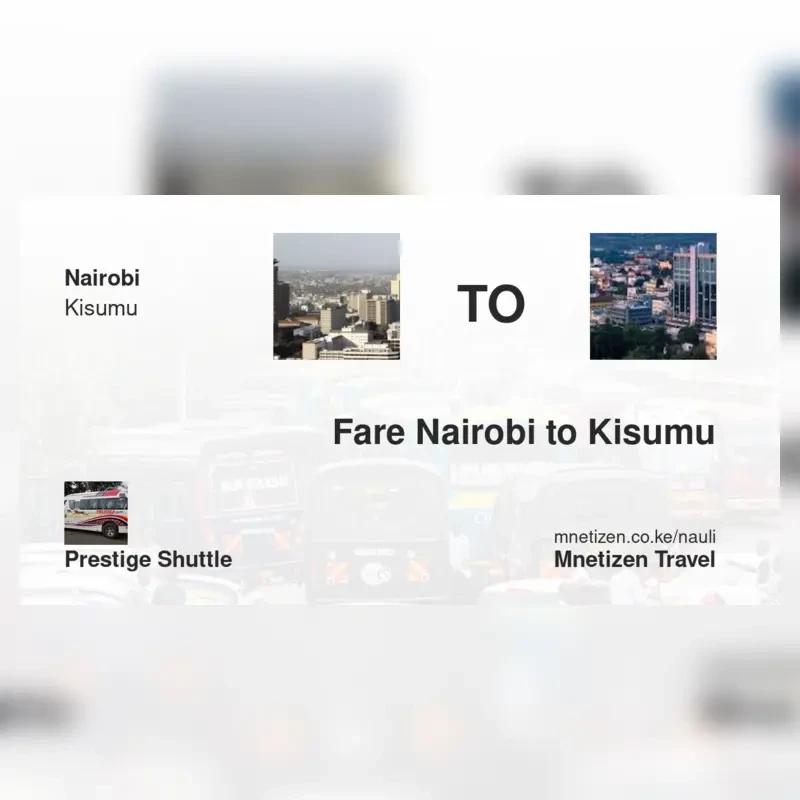 The fare from Nairobi to Kisumu with Prestige Shuttle is . Prices may vary during holidays and school terms.