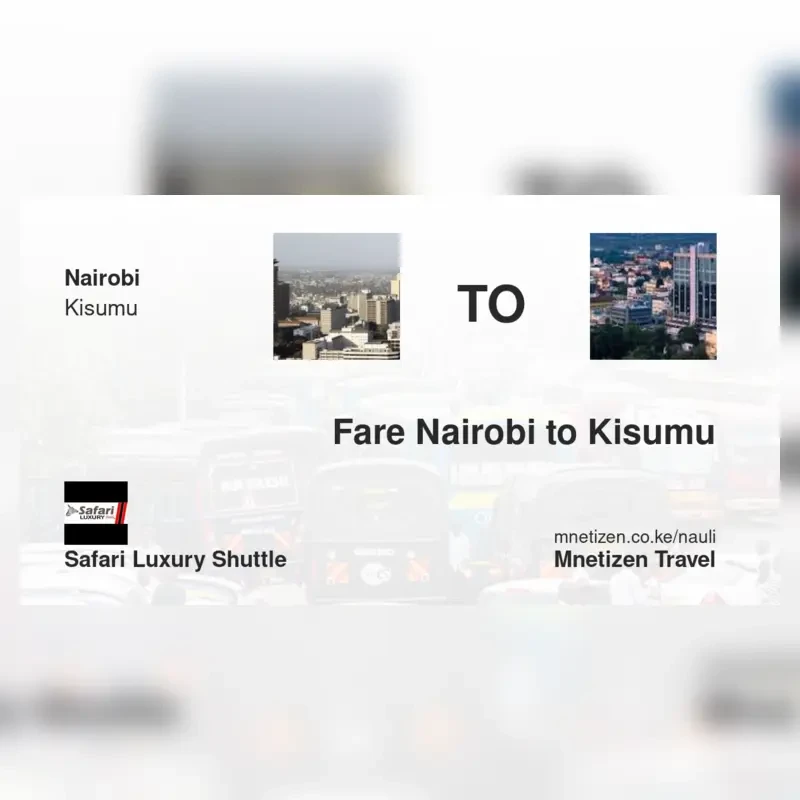 The fare from Nairobi to Kisumu with Safari Luxury Shuttle is . Prices may vary during holidays and school terms.