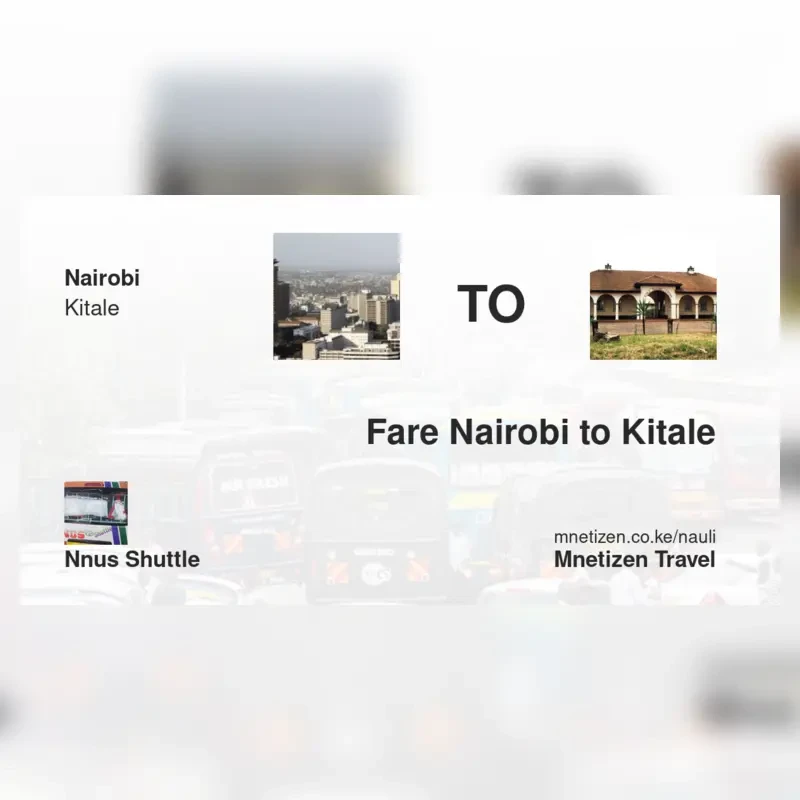 The fare from Nairobi to Kitale with NNUS shuttle is . Prices may vary during holidays and school terms.