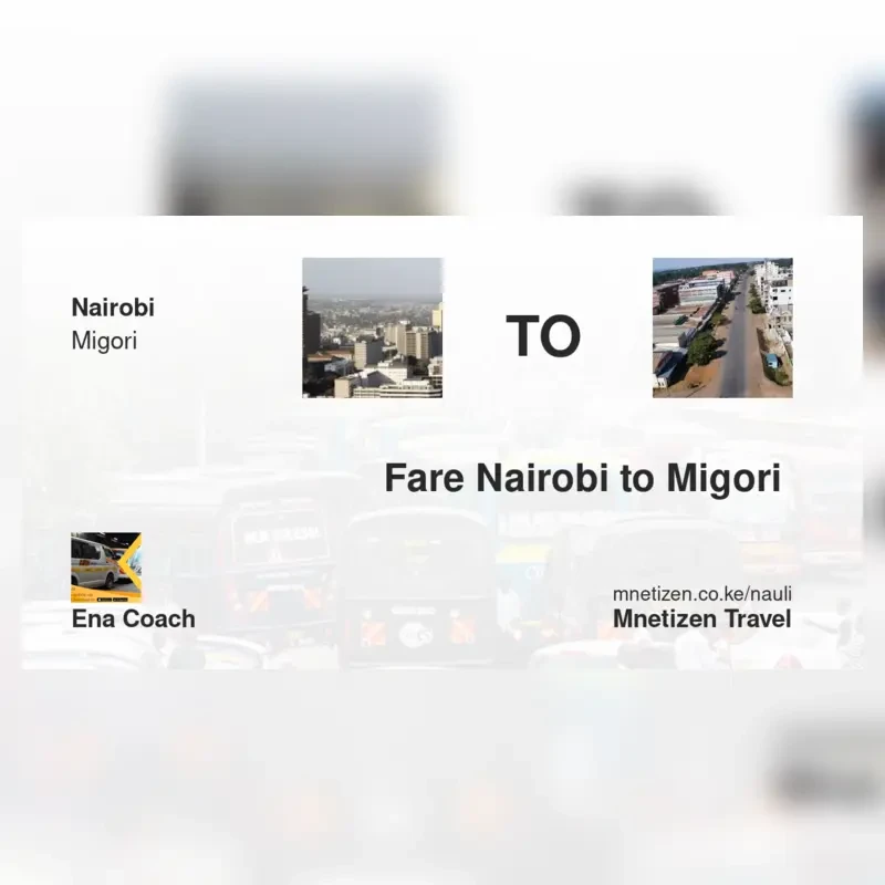 The fare from Nairobi to Migori with ENA Coach is . Prices may vary during holidays and school terms.
