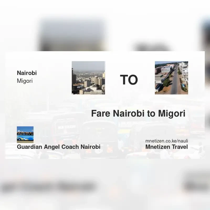 The fare from Nairobi to Migori with Guardian Angel Coach Nairobi is . Prices may vary during holidays and school terms.