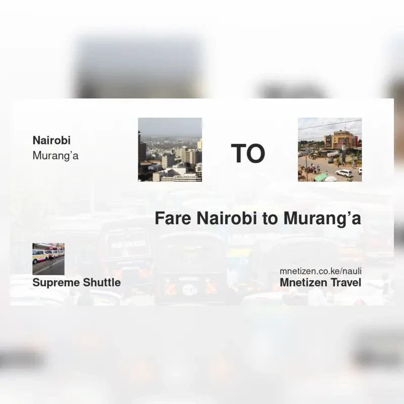 The fare from Nairobi to Murang’a with Supreme Shuttle is . Prices may vary during holidays and school terms.