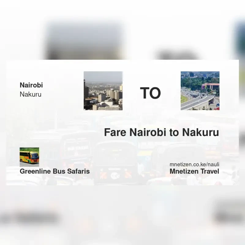 The fare from Nairobi to Nakuru with Greenline Bus Safaris is . Prices may vary during holidays and school terms.