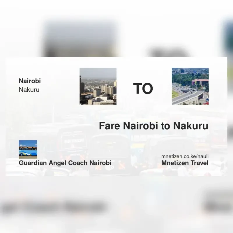 The fare from Nairobi to Nakuru with Guardian Angel Coach Nairobi is . Prices may vary during holidays and school terms.