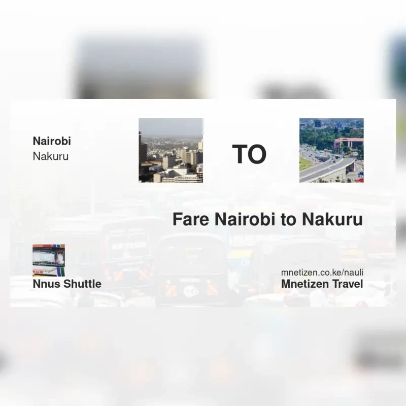 The fare from Nairobi to Nakuru with NNUS shuttle is . Prices may vary during holidays and school terms.