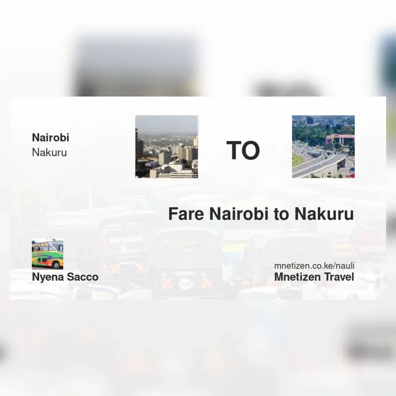The fare from Nairobi to Nakuru with Nyena Sacco is . Prices may vary during holidays and school terms.