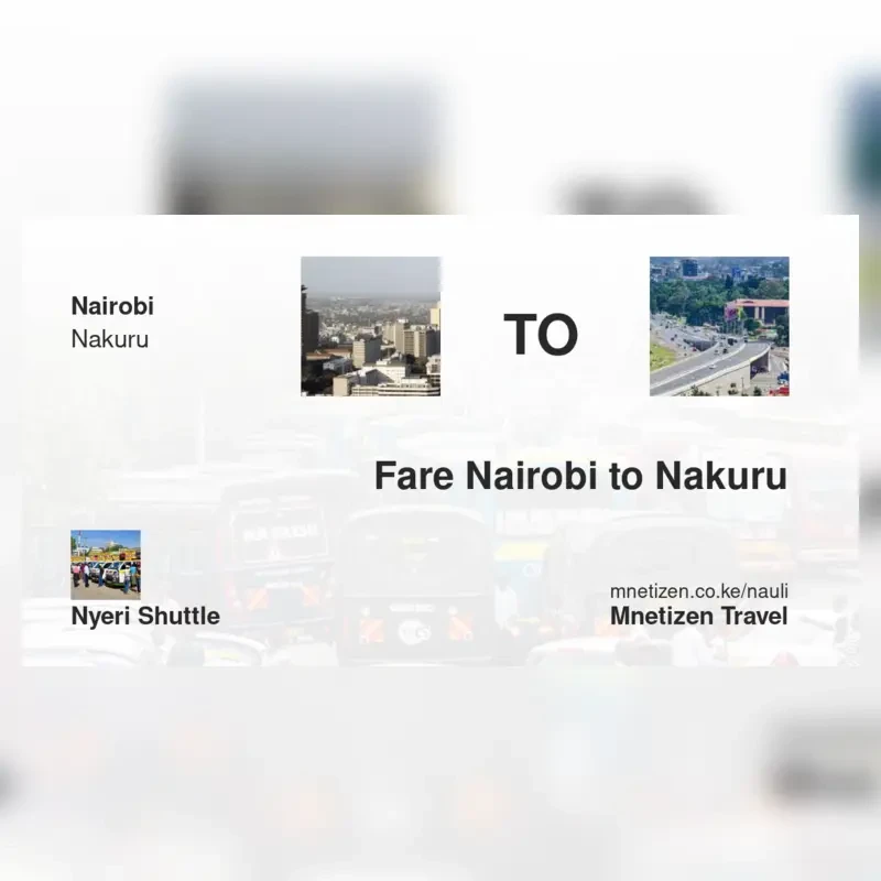 The fare from Nairobi to Nakuru with Nyeri Shuttle is . Prices may vary during holidays and school terms.