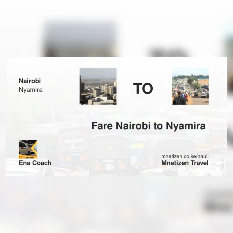 The fare from Nairobi to Nyamira with ENA Coach is . Prices may vary during holidays and school terms.