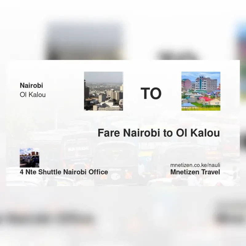 The fare from Nairobi to Ol Kalou with 4NTE Shuttle Nairobi Office is . Prices may vary during holidays and school terms.