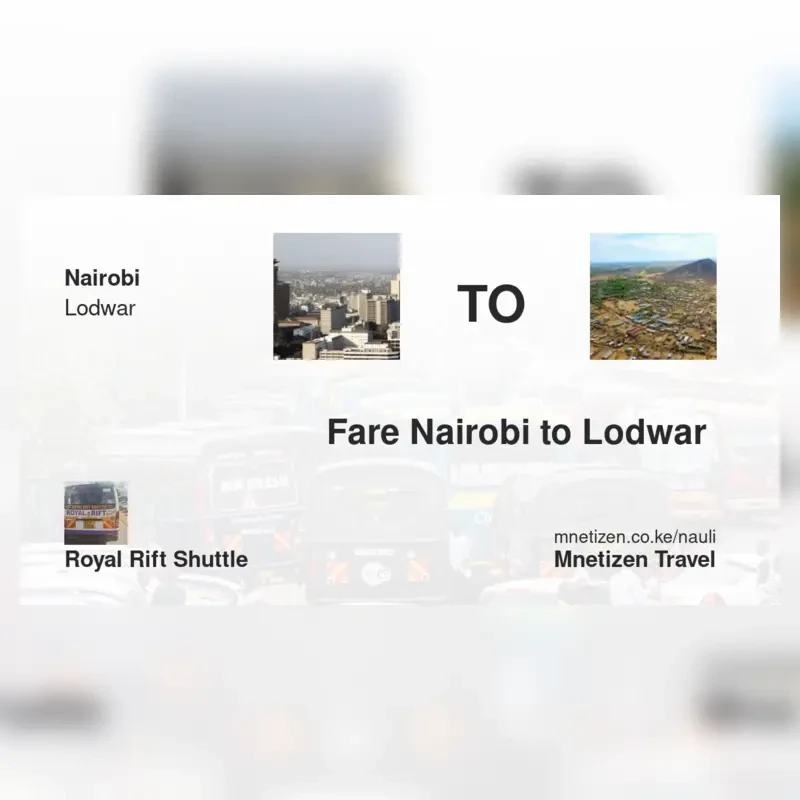 The fare from Nairobi to Lodwar with Royal Rift Shuttle is . Prices may vary during holidays and school terms.