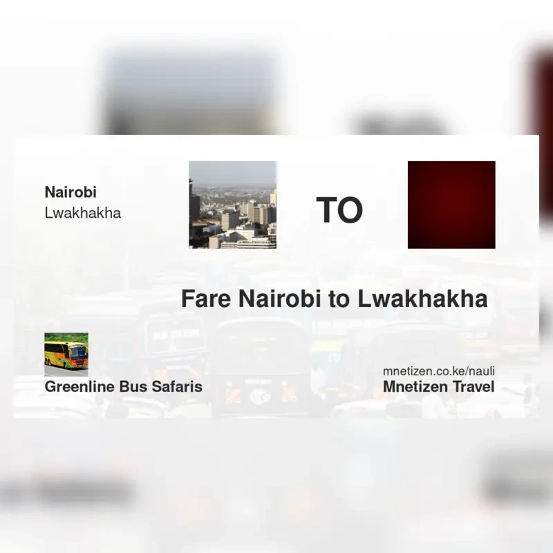 The fare from Nairobi to Lwakhakha with Greenline Bus Safaris is . Prices may vary during holidays and school terms.