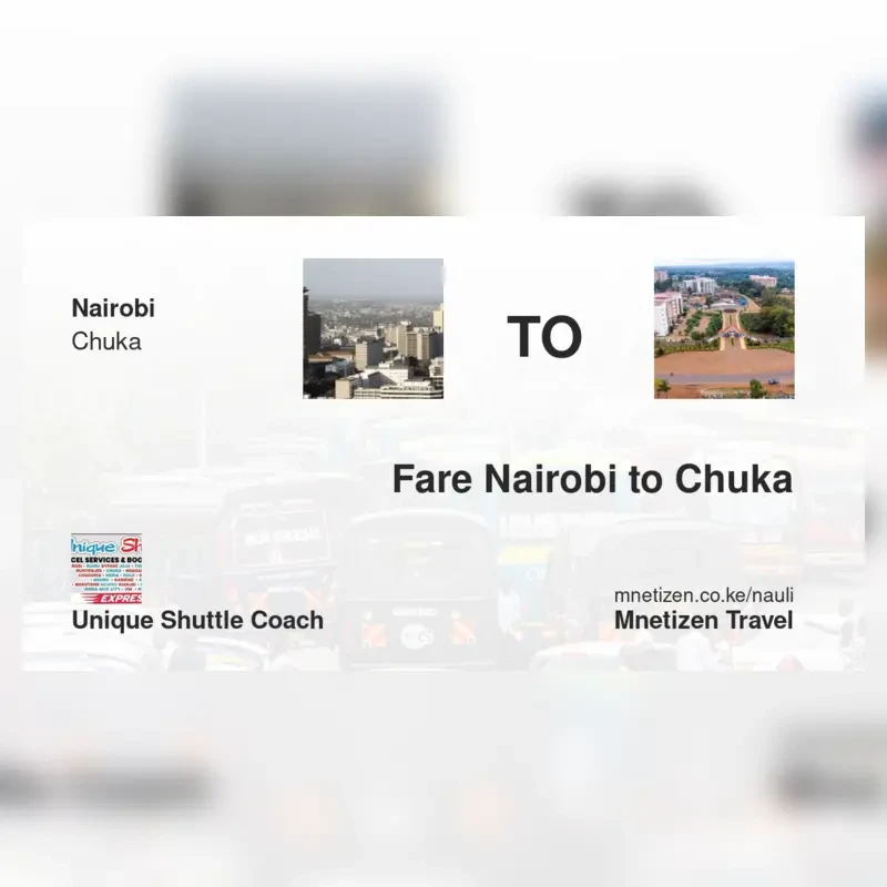 The fare from Nairobi to Chuka with Unique Shuttle Coach is . Prices may vary during holidays and school terms.