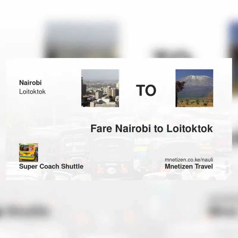 The fare from Nairobi to Loitoktok with Super Coach Shuttle is . Prices may vary during holidays and school terms.