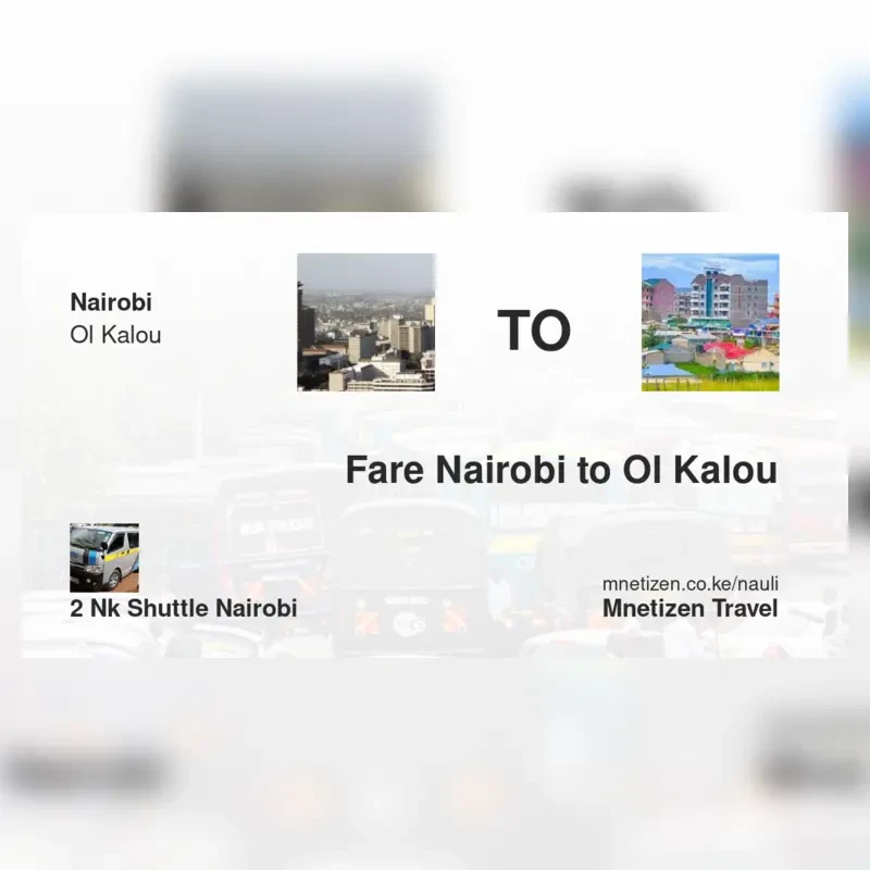 The fare from Nairobi to Ol Kalou with 2NK Shuttle Nairobi is . Prices may vary during holidays and school terms.