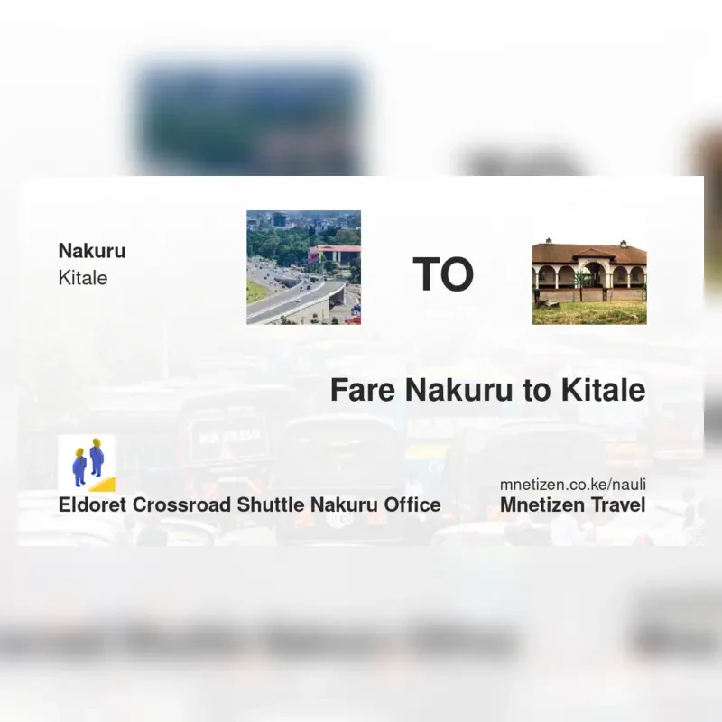The fare from Nakuru to Kitale with Eldoret crossroad shuttle Nakuru office is . Prices may vary during holidays and school terms.