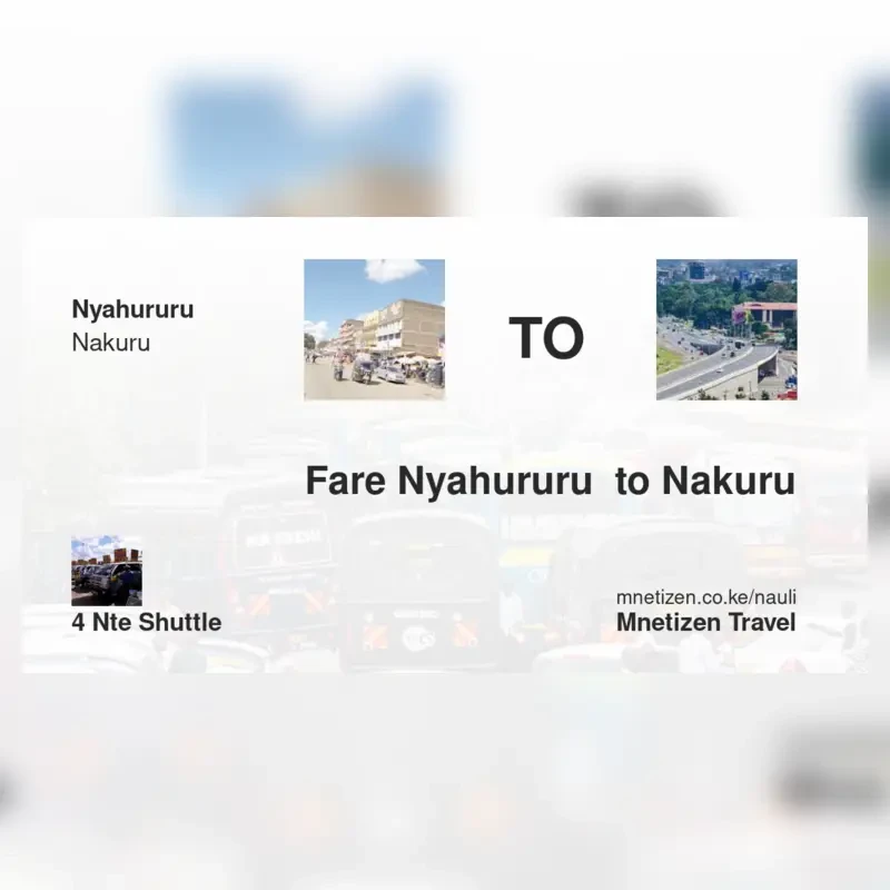 The fare from Nyahururu to Nakuru with 4NTE Shuttle is . Prices may vary during holidays and school terms.