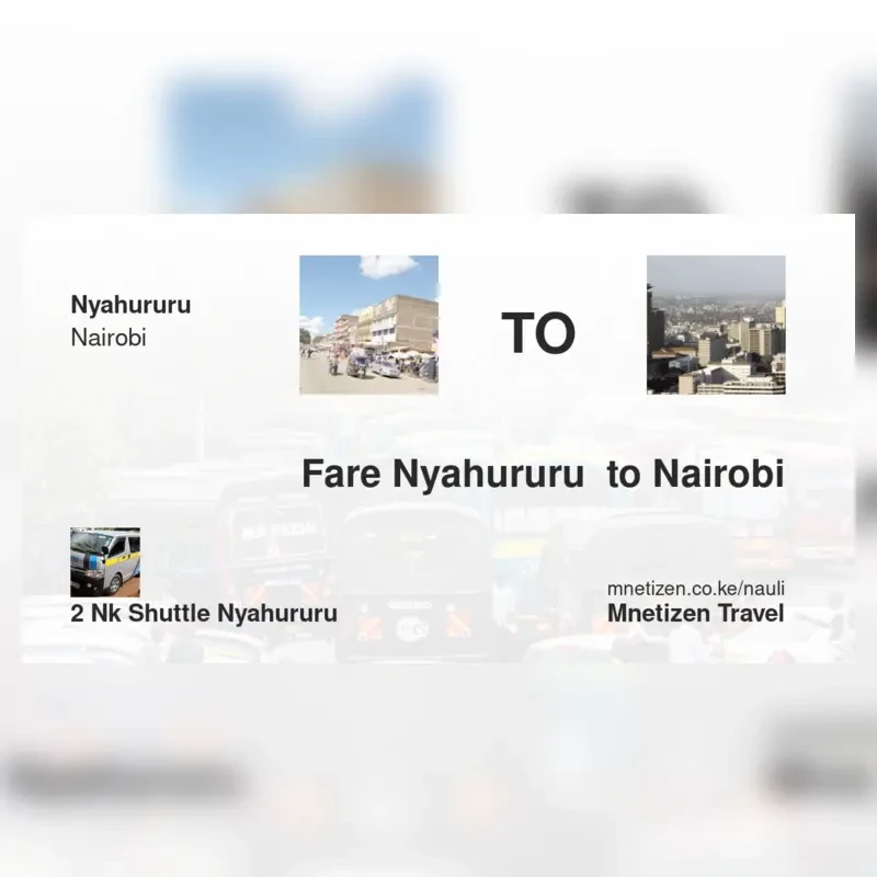 Top operators on this route include 2NK Shuttle Nyahururu , 4NTE Shuttle . Check current schedules and fares.