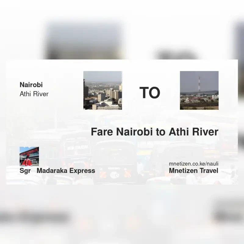 | Nairobi Athi river | Sgr - madaraka express Train | 30 Kms | 15 mins | ksh 90 Book |