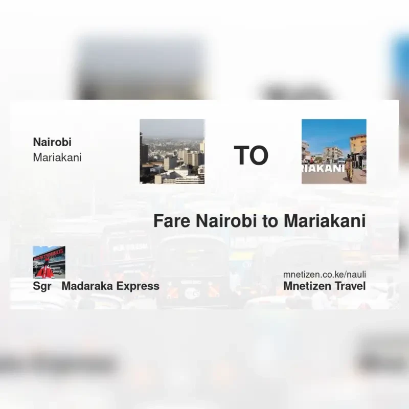 The fare from Nairobi to Mariakani with SGR - Madaraka Express is ksh 1,410. Prices may vary during holidays and school terms.