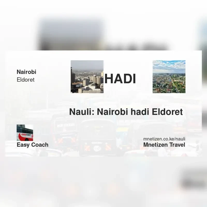 The fare from Nairobi to Eldoret with Easy Coach is . Prices may vary during holidays and school terms.