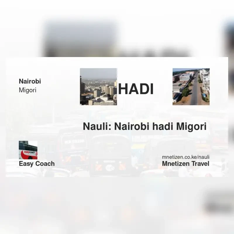 The fare from Nairobi to Migori with Easy Coach is . Prices may vary during holidays and school terms.
