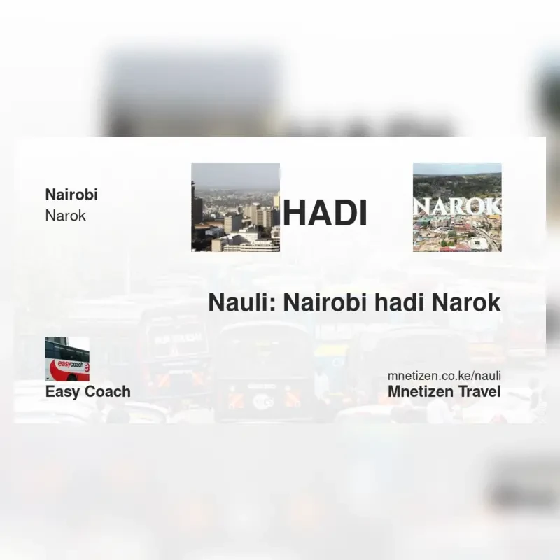 The fare from Nairobi to Narok with Easy Coach is . Prices may vary during holidays and school terms.
